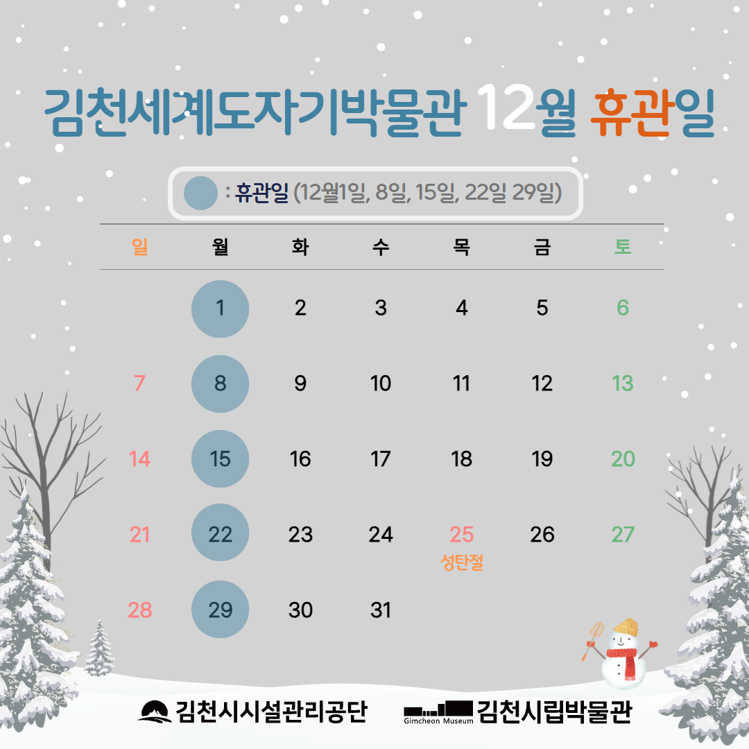 12월 김천세계도자기박물관 휴관일 안내입니다.