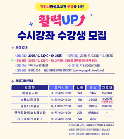 ② 김천시평생교육원은 서비스의 운용과 관련하여 서비스 화면, 홈페이지, 전자우편 등에 광고 등을 게재할 수 있으며, 김천시평생교육원은 서비스를 이용하고자 하는 회원이 이 광고게재에 대하여 동의하는 것으로 간주합니다.